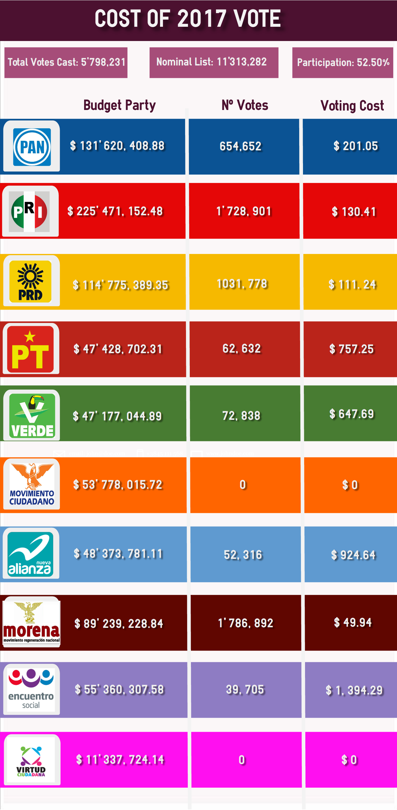 On the counterpart, the cost of PAN’s vote was 201.05 pesos; PRI’s vote cost 130.41 pesos (the party got a budget of 225’471,152.48 pesos); PRD’s vote cost 111.24 pesos; PT’s vote cost 647.69 pesos (despite its rachitic amount of votes) so this made it the most expensive one.