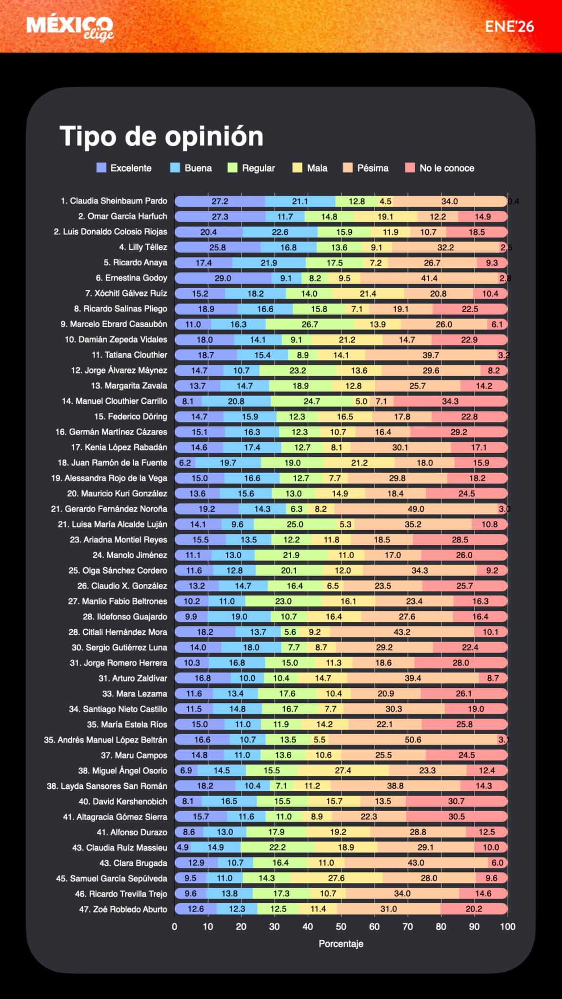 En una reciente encuesta de la firma “México Elige” revela que al menos 38.5 por ciento de los mexicanos tiene una mala o pésima opinión de la presidenta Claudia Sheimbaum y 12% una “regular”, sin embargo, encuestas internacionales que midieron las expectativas de la presidenta para el 2026 en materia de opinión pública, por segunda vez la colocaron en un punto de considerable impopularidad, con 49% de rechazo, en un contexto en México en el que crecen las desapariciones masivas, las fosas ilegales, las falsas estadísticas de reducción de homicidios y los escándalos de corrupción.