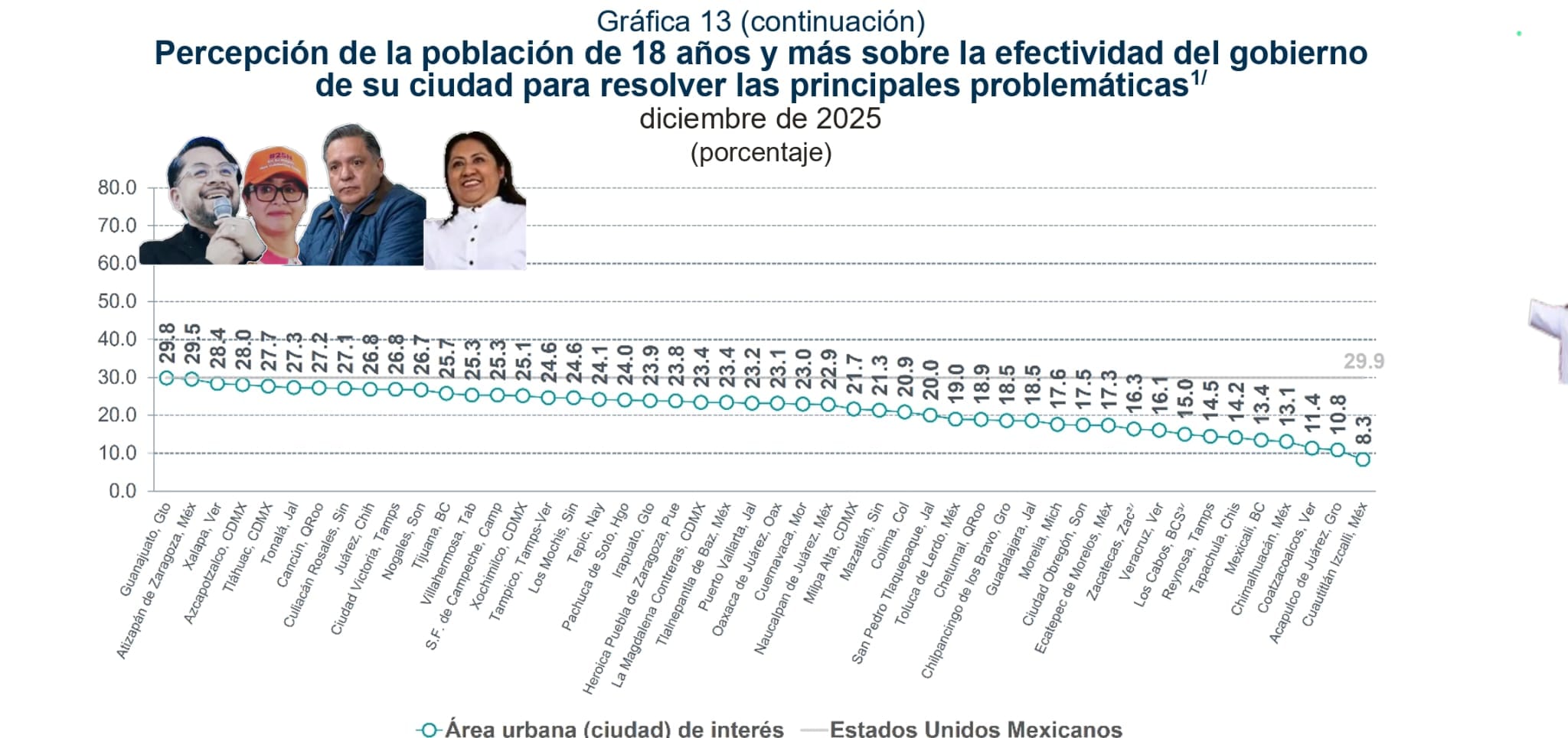 En la encuesta ENSU del INEGI solo el 17.3% de los ecatepenses encuestados consideraron que Cisneros Coss de Morena es “muy o algo efectiva” en su gestión, lo que significa -por deducción matemática- que el 82.7% de los entrevistados por el organismo en su jurisdicción la reprobaron, mientras que a Xóchitl Flores de Chimalhuacán lo hizo el 86.9%, y al edil de Cuautitlán Izcalli, Luis Daniel Serranos Palacios -con graves problemas en desaparición de personas- lo reprobó el 91.7% y ni un 10% de los izcallenses lo considera un alcalde eficaz.