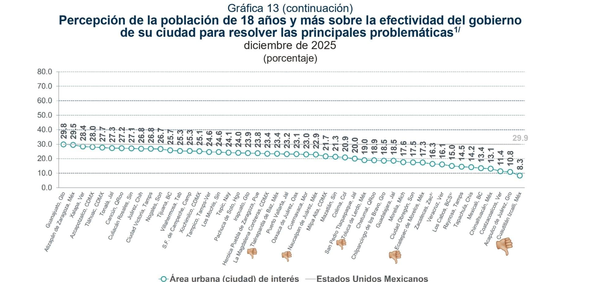 El INEGI levantó por supuesto cuáles son las principales necesidades o problemas de la población en las cien ciudades más importantes de México, destacando en primer lugar los baches en calles y avenidas (86.5%); en segundo lugar las fallas y fugas en el suministro de agua potable con 63.9%; calles y avenidas con embotellamientos frecuentes; 61.2%; alumbrado público insuficiente (60.8%); así como coladeras tapadas por acumulación de desechos (59.9%); hospitales saturados o con servicio deficiente (57.5%), aunque en este caso la responsabilidad recae en el gobierno de Delfina Gómez y el gobierno federal.