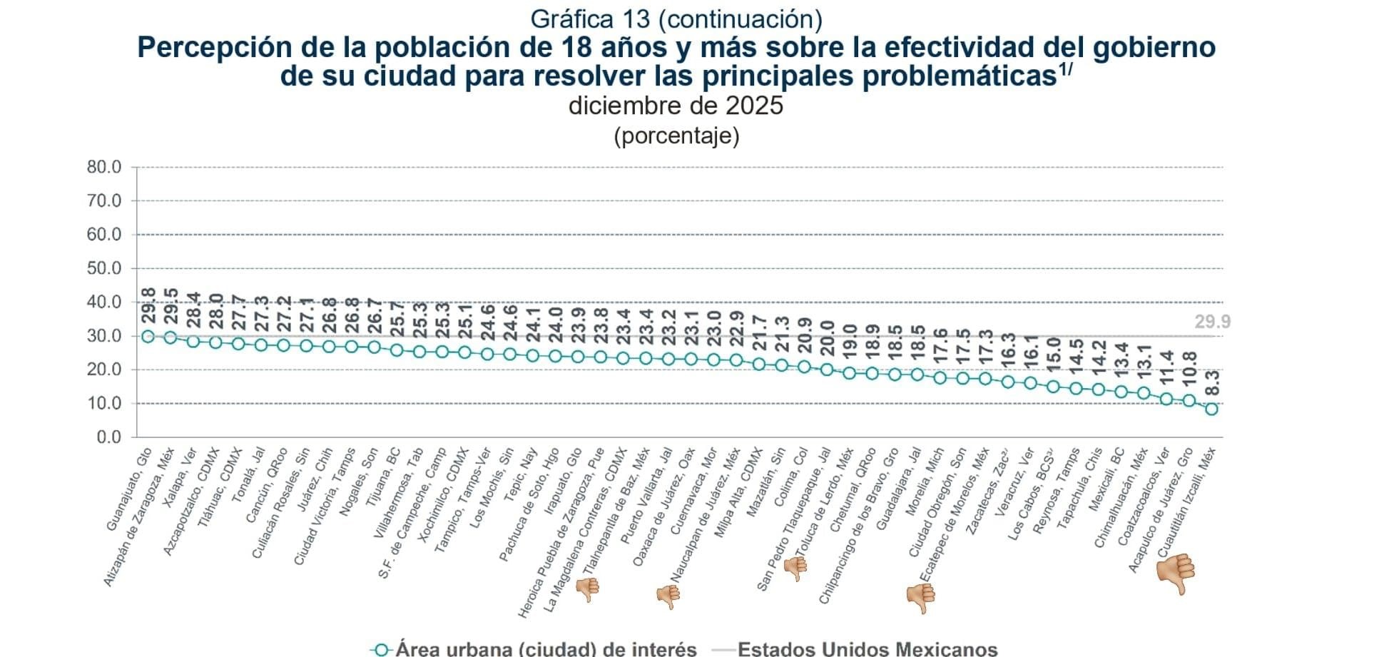 El INEGI levantó por supuesto cuáles son las principales necesidades o problemas de la población en las cien ciudades más importantes de México, destacando en primer lugar los baches en calles y avenidas (86.5%); en segundo lugar las fallas y fugas en el suministro de agua potable con 63.9%; calles y avenidas con embotellamientos frecuentes61.2%; alumbrado público insuficiente (60.8%); así como coladeras tapadas por acumulación de desechos (59.9%); hospitales saturados o con servicio deficiente (57.5%), aunque en este caso la responsabilidad recae en el gobierno de Delfina Gómez y el gobierno federal.